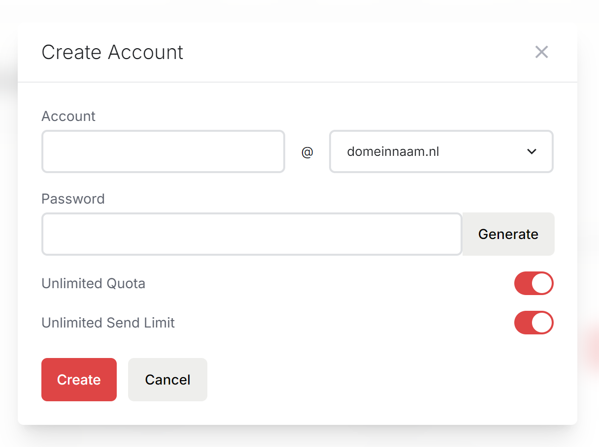 - Mot de passe : Le mot de passe que vous souhaitez définir pour le compte e-mail. Vous pouvez également choisir de générer un mot de passe fort sous Générer.