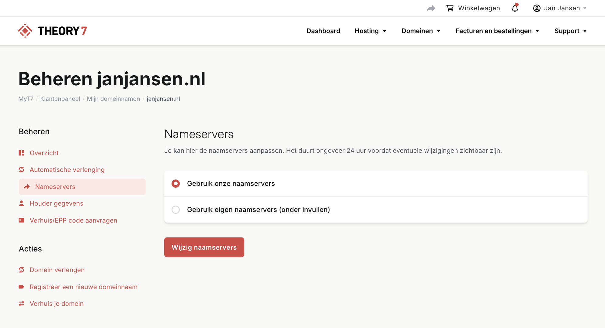 - Pas de nameservers aan naar de waarden die je gekregen hebt in de e-mail van jouw nieuwe hostingpakket. De makkelijkste manier is om te klikken op "Gebruik onze Nameservers" bij het beheren van je domeinnaam.