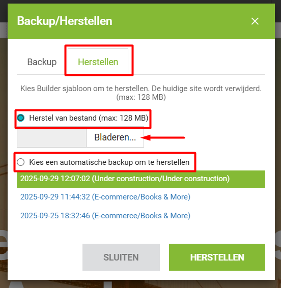 Naast dat je zelf een back-up kunt maken maakt Sitebuilder zelf ook (automatisch) back-ups van je website. Deze back-ups worden elke 5 minuten gemaakt echter alleen zolang er wijzigingen aan je website worden aangebracht. Deze back-ups staan op de server van Sitebuilder.