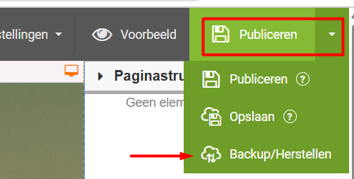 Wanneer je een back-up wilt terugzetten dan klik je, rechtsboven op de startpagina, op de uitklapoptie bij 'Publiceren'. Hierna kies je voor 'Backup/Herstellen'