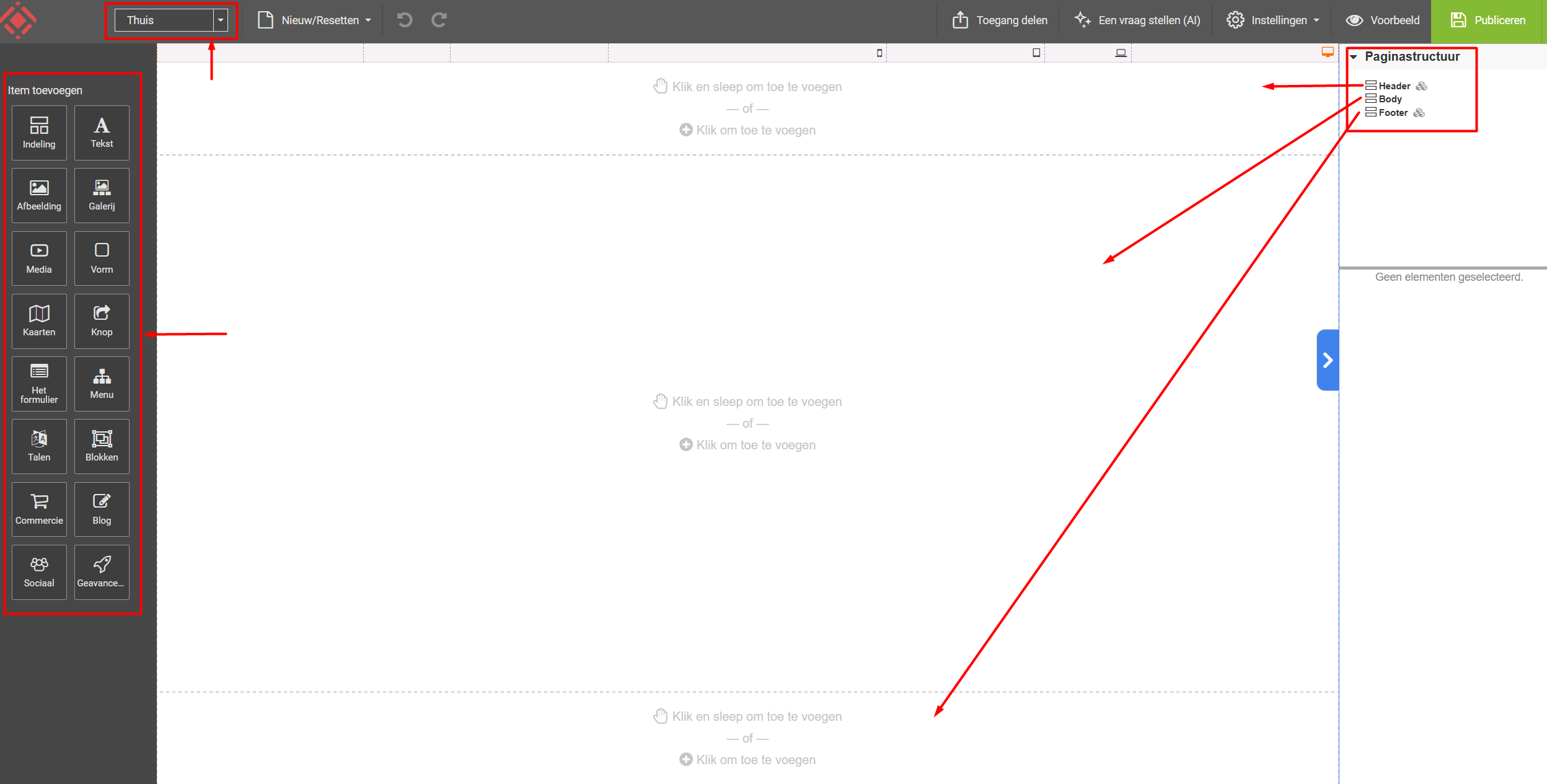 Aan de linkerkant van de pagina zie je een groot aantal items. Deze items hebben allemaal betrekking op de pagina die je op dat moment aan de rechterkant aan het bouwen bent. Voor meer informatie over deze items, klik dan hier.